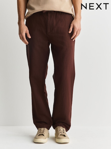 Burgundy Red Straight Fit Cotton Linen Blend Twill Chino Trousers