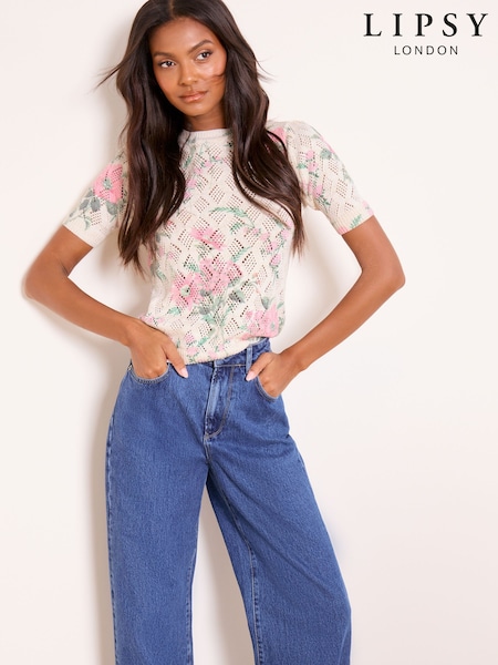 Lipsy Ivory Knitted Crochet Floral Print Sparkle Top